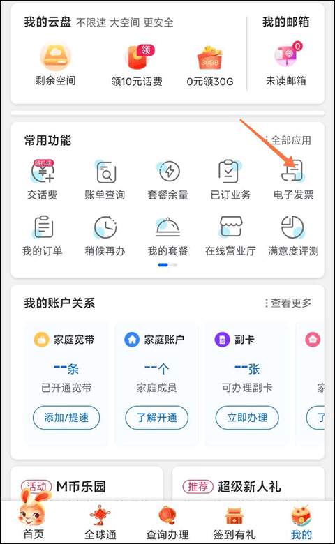 进入个人界面后,能看到不少和我们生活相关的功能,像账单查询、我的套餐、交话费这些,接着在常用功能里找到电子发票,点击它就可以了。