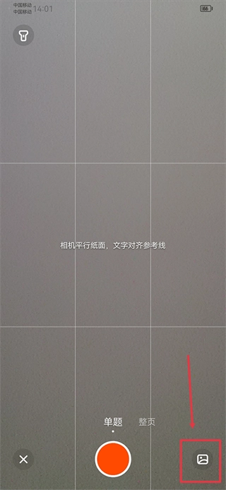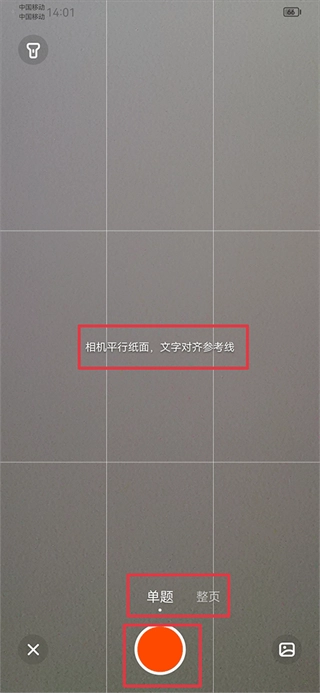 2、进入后,在拍照区域上方选择“拍单题”或“整页拍”模式,接着将相机保持平行正对,待文字与参考线对齐后,点击红色的拍照按钮即可。