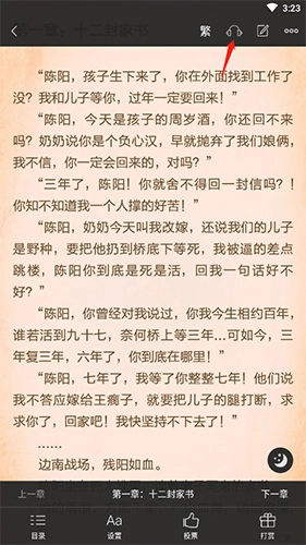 4、开启听书功能的操作步骤:在阅读界面点击屏幕中间区域,调出工具栏后,点击工具栏右上角的“听书”图标即可。