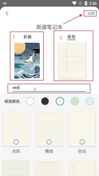 第三步:挑选笔记本封面,选定笔记本的纸张类型与颜色,填写好笔记本名称后点击“创建”按钮就完成了。