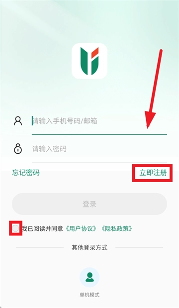 打开军视云监控,进入登录界面后,勾选“我已阅读并同意”旁边的《用户协议》和《隐私政策》,然后点击立即注册按钮。
