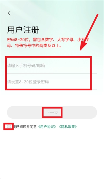 用户在注册界面依次填写手机号码或邮箱、设置密码,接着勾选“我已阅读并同意《用户协议》和《隐私政策》”,最后点击“下一步”获取验证码,完成注册流程即可。