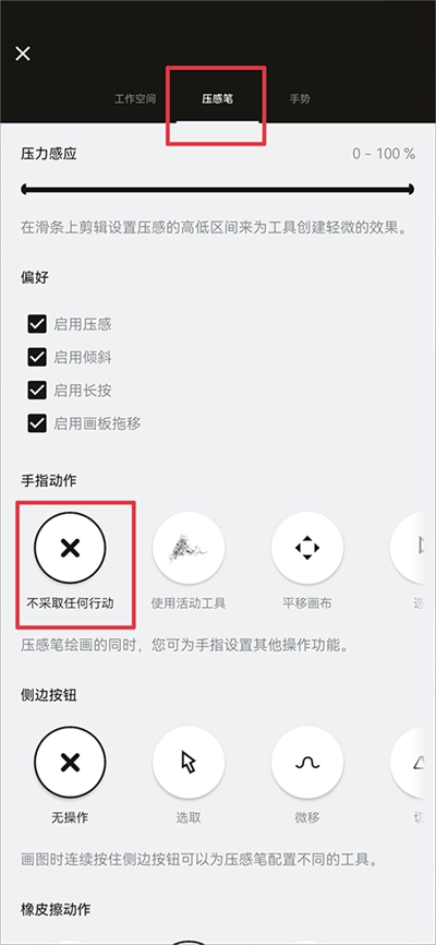3. 最后在压感笔界面的手指动作设置里,选择“不采取任何行动”就能完成关闭操作。