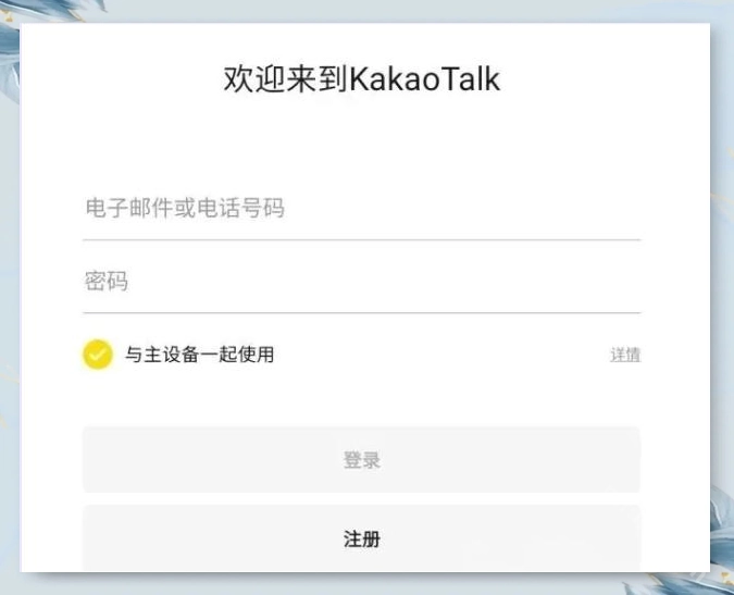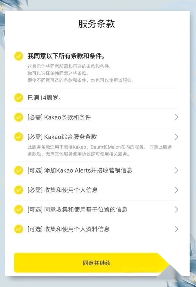 2、启动KAKAO TALK应用后,点击“注册”按钮开启注册流程。在弹出的窗口里,勾选“同意并继续”选项,随后进行下一步操作。