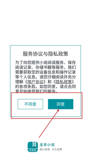 1、打开【全本小说】阅读器,点击【同意】按钮,就能使用小说阅读、阅读记录保存等服务。