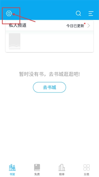 2、在书架界面,点击顶部的【设置】图标就能进入配置页面;要是书架上没有书籍,还可以通过【去书城】按钮来浏览并添加书籍。