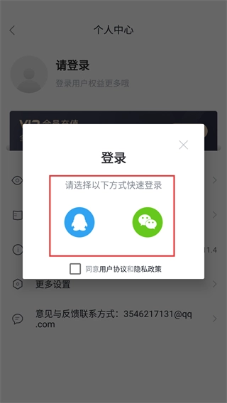 4、登录弹窗提供【QQ】和【微信】两种快速登录方式,用户勾选协议后选择对应的登录方式,就能完成账号登录操作。