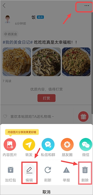 2、找到你发布的帖子并点击进入,然后点击右上角的“…”图标,在弹出的选项中选择删除或编辑,就能完成相应操作了。