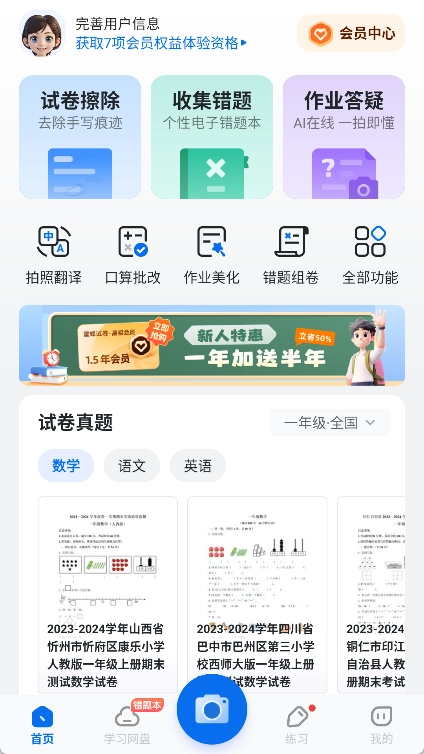2. 选择试卷:随意打开应用,在主界面里找到底部导航栏的拍摄按钮并点击。