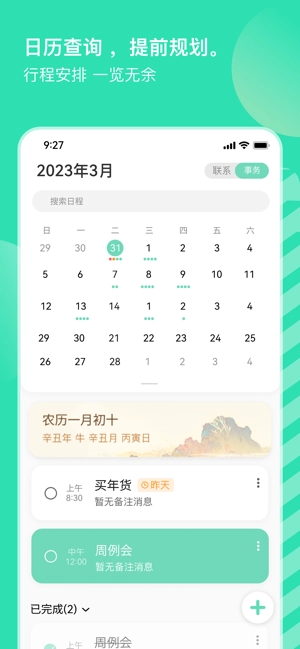 - 支持年、月、周多维度视图切换,关键节点可显示农历信息
