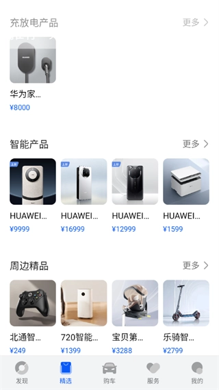 2、精选版块包含“购物频道”,在这里可以购买华为旗下的各类产品,而“周边精品”板块则提供四款智选产品。