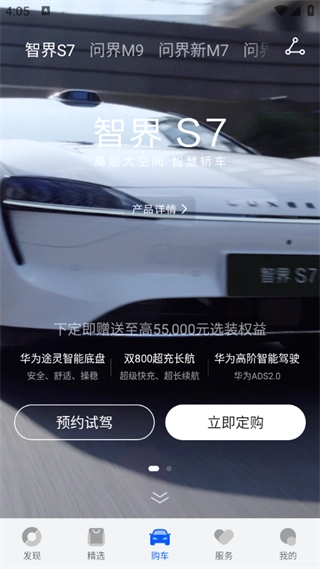 3、购车版块支持预约试驾与车辆订购,当前仅上线智界S7车型,同时配备专属购车顾问的联系电话