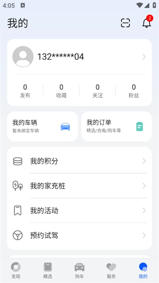 应用目前由发现、精选、购车、服务、我的这五大版块组成。