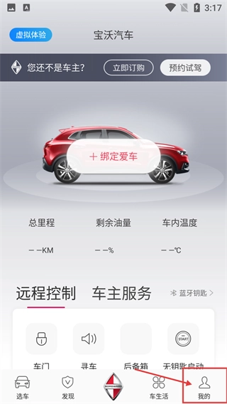 在宝沃汽车主界面,点击底部的【我的】选项即可进入个人中心页面。该页面提供车辆绑定、远程控制等功能,不过这些功能需要登录账号后才能使用。