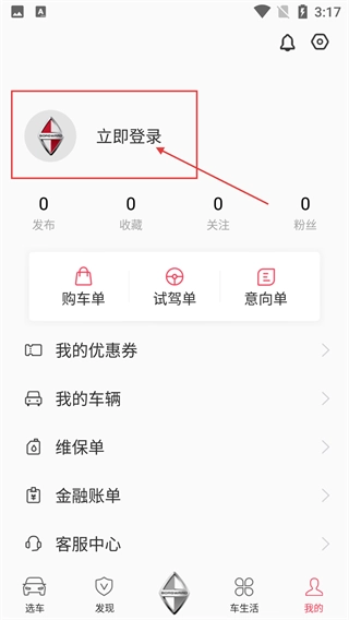 进入个人中心后,点击顶部的【立即登录】区域,就能跳转到登录界面,这个页面还包含了购车单、优惠券等车主服务的入口。