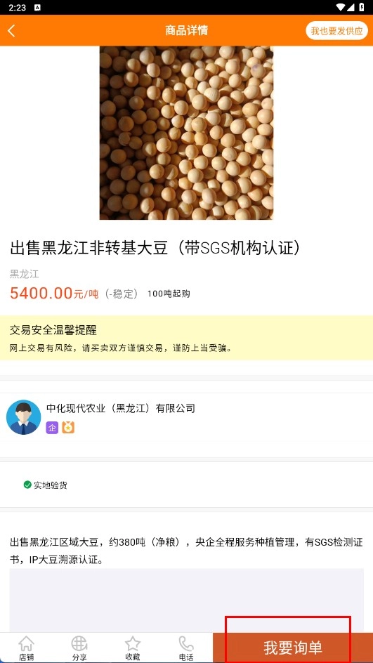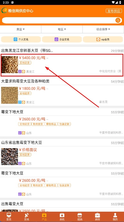 3、在商品列表页面,点击你感兴趣的商品条目,比如“出售黑龙江非转基因大豆(带SGS机构认证)”,即可进入该商品的详情页面。