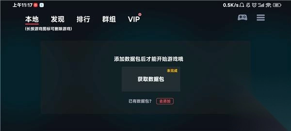 2、点击获取数据包,加入群组后向资深玩家求助,获取到数据包后再进行添加操作。