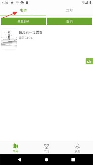 2、点击书架界面,含批量删除搜索功能,提示使用前需查看,显示阅读进度。