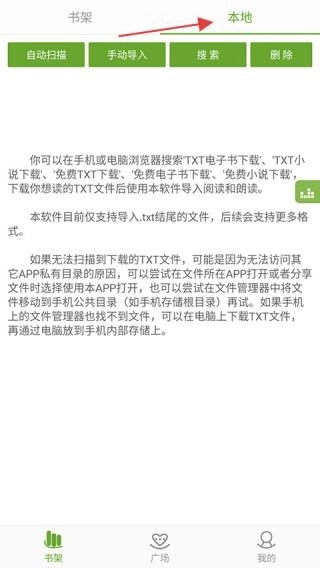 3、点击本地导入页面,支持自动扫描、手动导入TXT文件,说明文件及导入方法。