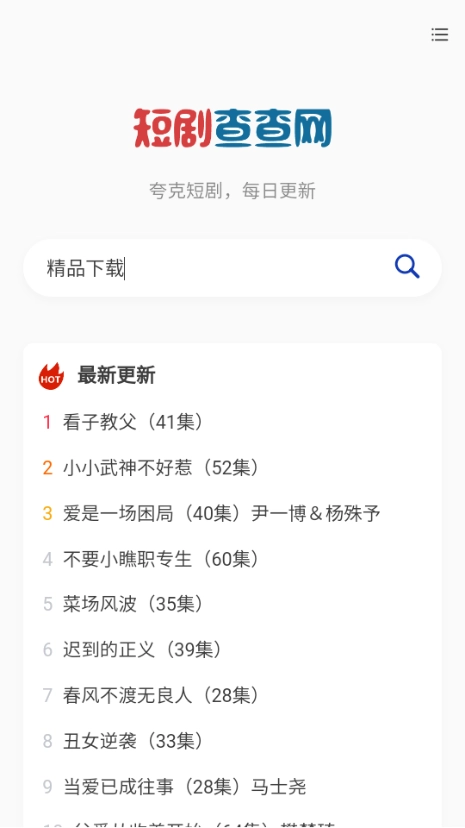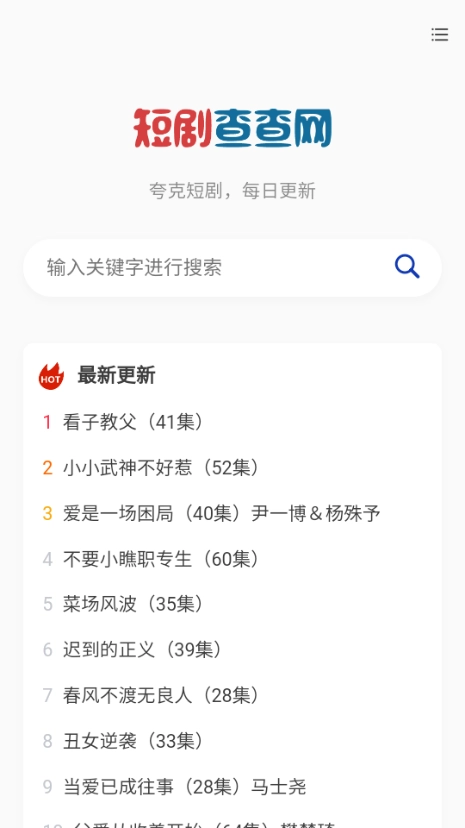 短剧查查网是专注于短剧内容的夸克短剧平台,致力于为用户提供丰富的短剧资源与便捷的观看体验。用户可借助搜索或分类功能,轻松找到各类题材的短剧,并通过夸克App进行播放。平台在设计上重视用户体验,力求让观众能充分享受短剧带来的乐趣。
