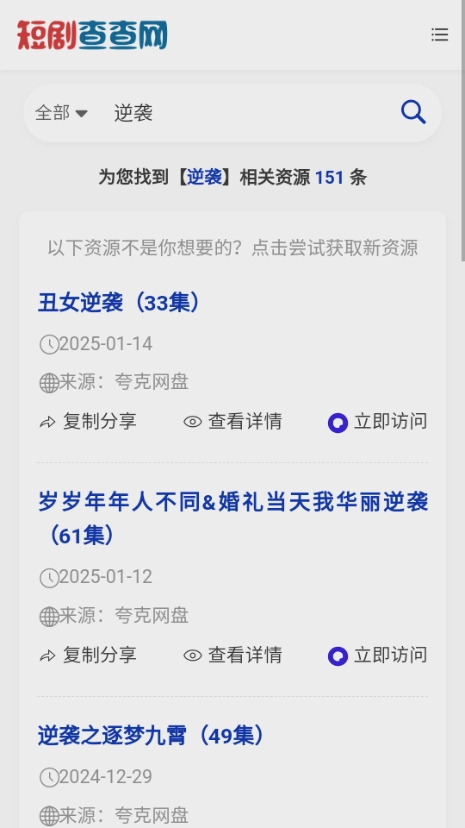 给大家分享短剧查查网这款软件,它是个相当不错的短剧资源查询平台,数据直接连接夸克网盘。用户能在这里直接搜索自己感兴趣的短剧,一秒就能获取片源,以后看剧再也不用花一分钱啦。