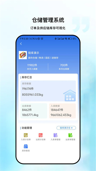 链库冷库数据是一款功能全面的办公软件,为用户提供可视化服务,可提升行业管理效率,覆盖冷链运输管理全过程,能根据企业需求进行个性化定制,最大限度提高快速送货效率,感兴趣的小伙伴快来体验吧。