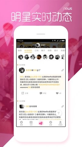 我们还会为大家推送明星动态提醒,涵盖明星在微博、Instagram、Facebook、Twitter等社交平台上的实时更新,助力粉丝第一时间掌握偶像的最新动态。此外,我们设有超级星周刊栏目,每周一准时上线,为大家呈现封面明星故事、一周热点事件,与粉丝们共同分享精彩内容。同时,我们具备直播偶像现场时修复线上已知bug的功能,保障粉丝能够流畅观看偶像的现场直播。