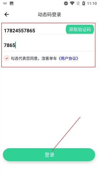4、在【动态码登录】页面输入账号,获取并填写【验证码】,勾选相关协议后点击【登录】按钮,即可完成账号登录操作。