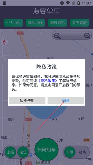 1、仔细阅读【隐私政策】条款内容后,点击【同意】按钮,就能开启浩客单车的服务,进入主界面使用各项相关功能。