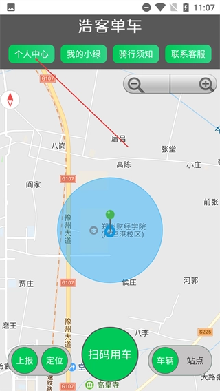 在主界面能够查看地图和车辆分布情况,点击【个人中心】按钮就能进入登录界面,登录后可以对个人的骑行相关信息进行管理。