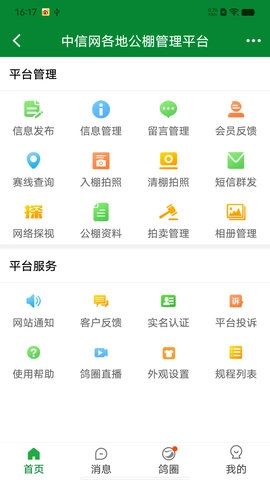 这款商家管理平台主要涵盖以下模块:信息发布、信息管理、留言管理、客户反馈、在线充值、购买广告点数、分享推广和实名认证。其中,信息发布模块能够助力商家将信息发布至平台,商家可借助该模块发布赛鸽公棚、信鸽协会、赛鸽俱乐部以及铭鸽展厅的相关内容,让用户能够及时知晓赛鸽行业的动态。