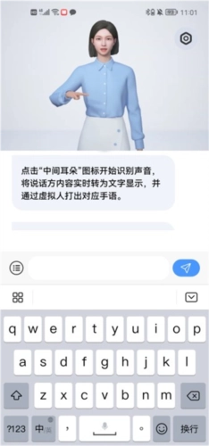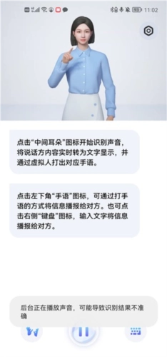 4、点击中间的耳朵图标就能进行语音识别,当你说出需要翻译的句子后,上方的虚拟人会做出对应的手语动作。