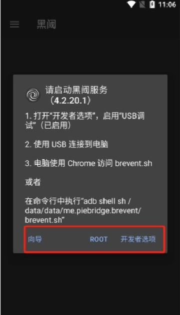 2、在设备中运行“黑阈”软件,仔细阅读它的向导,点击开发者选项。