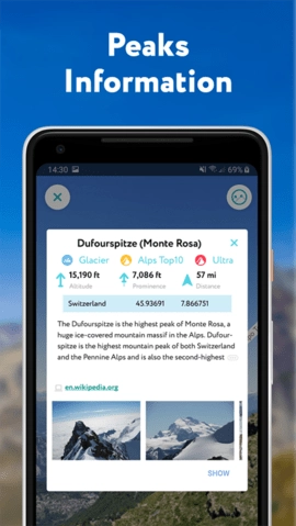 PeakVisor具备强大的山峰识别功能,能精准识别全球超百万座山峰并提供详尽信息,涵盖海拔高度、地形特点、所属山脉范围,以及周边国家公园和保护区的相关内容。用户还可浏览这些山峰的相关照片与维基百科页面,从而深入了解每座山峰的历史故事与背景知识。它不只是一款地图工具,更是一座知识的宝库,让用户在探索自然的过程中收获丰富的知识与资讯。
