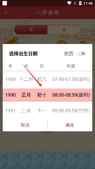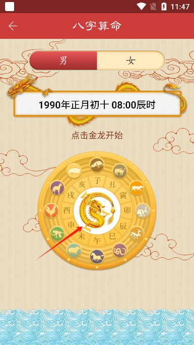 3、出生日期选择完成后,点击最中间的金龙开始测算