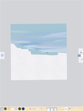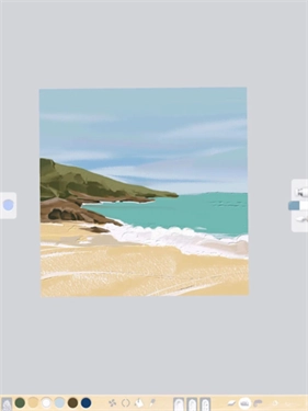 通过调节笔刷的透明度与干燥强度,能够营造出干画法的质感,像沙滩上的白色纹理就可以这样表现。