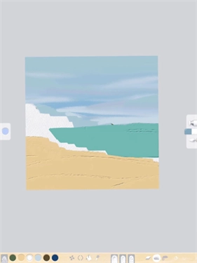2、用刮刀铺陈大色块,通过吸取颜色来调配深色、浅色或调整色相进行混色;混色时使用油画笔刷,再用磨平纹理工具做融合处理。这种混色方法适用于天空、沙滩等需要自然过渡的场景。