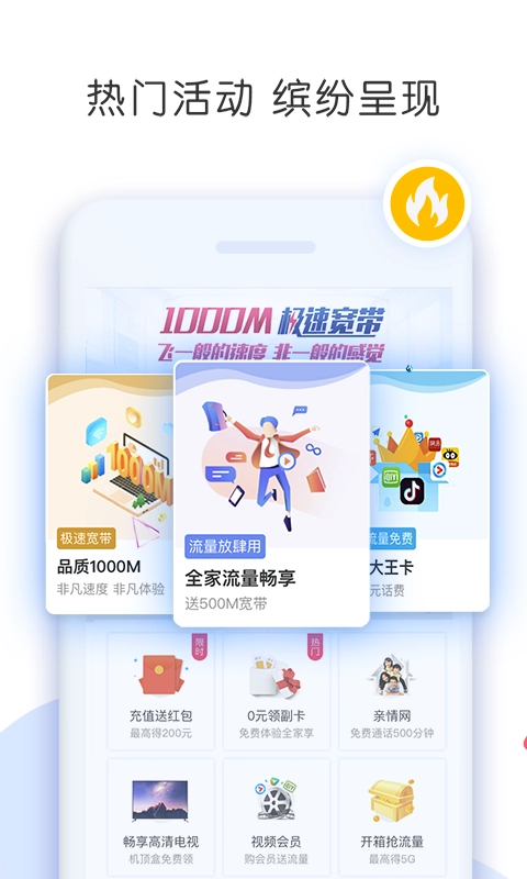 话费充值、账单详单查询、积分商城、流量叠加、宽带续约及提速,一站式解决。