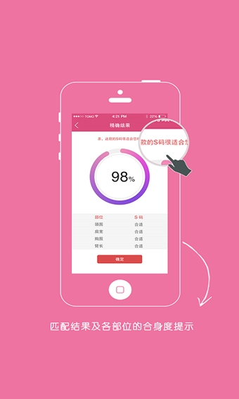 3、轻松选定衣服的品类、版型与弹性,不管何时何地都能给出合身尺寸,轻松解决无法试衣的困扰!要是想给亲朋好友买衣服?有“衣拍即合”在,线上线下都能畅快选购!
