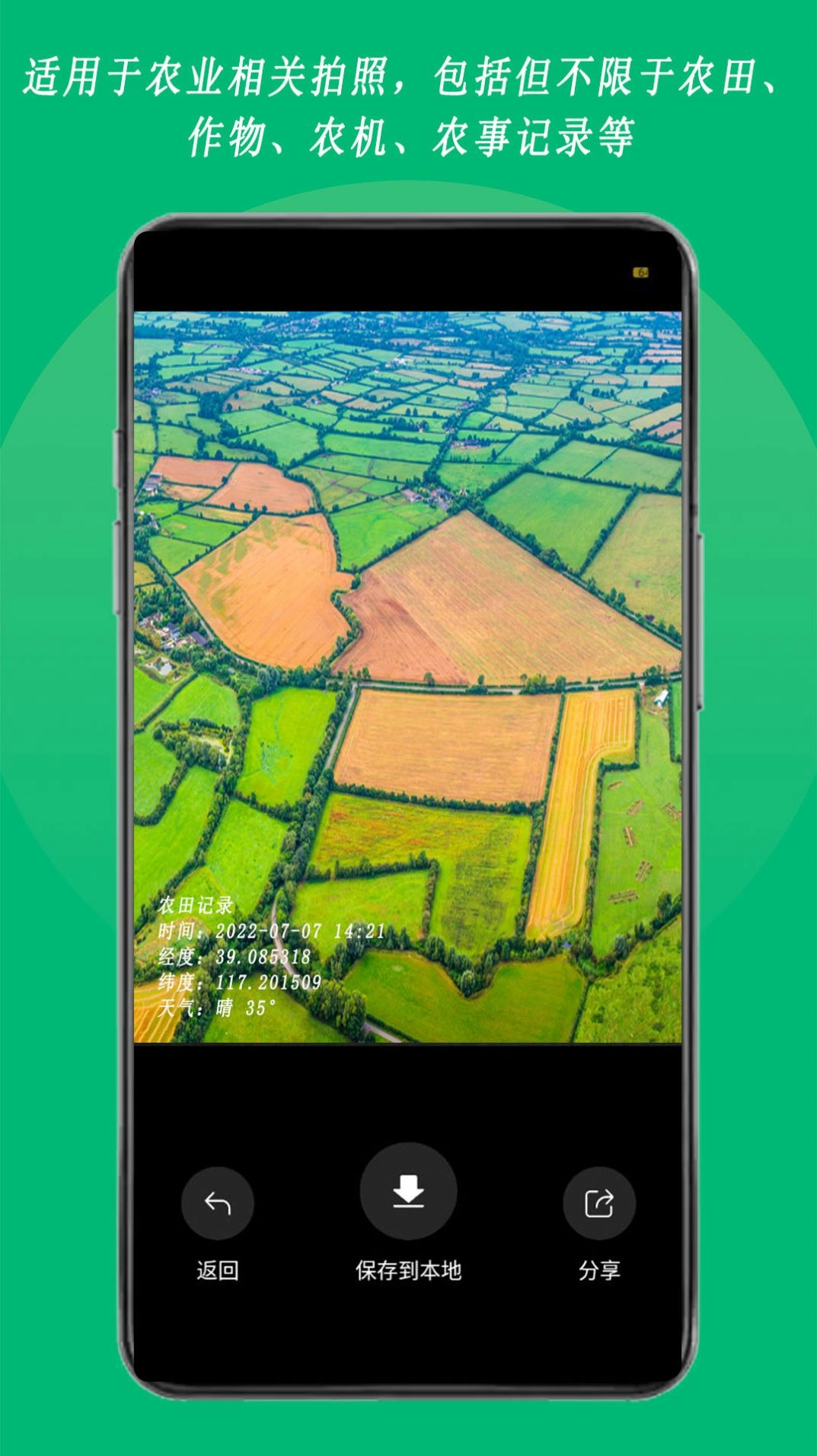 1、这是一款能通过图片记录农业相关操作,并带有水印功能的拍照相机应用。