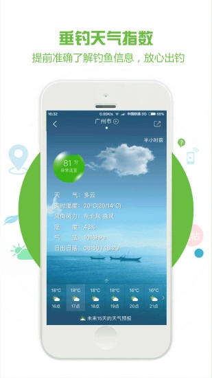 1、钓鱼指数与钓鱼天气预报(涵盖气压、湿度、风向等要素),助您掌握精准信息,从容享受垂钓时光;