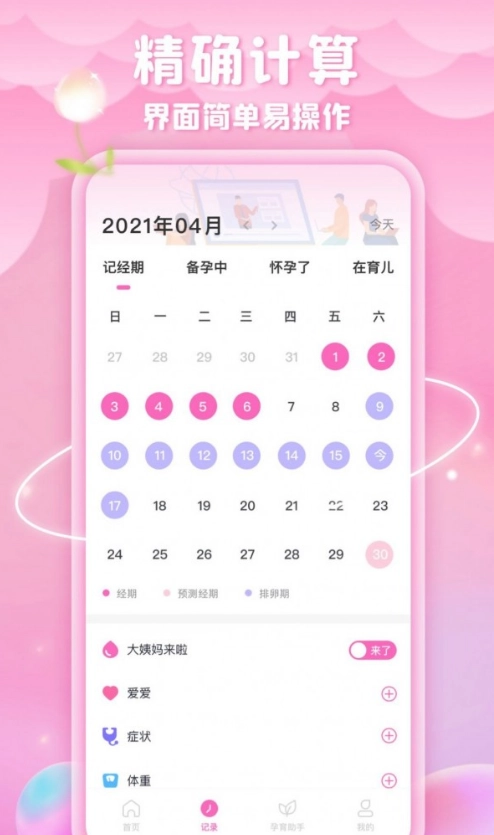 1、一键记录例假,精准预测姨妈周期