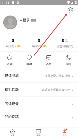 1、在【我的】页面,能查看收益、积分等信息,点击右上角的齿轮图标,即可进入【设置】界面调整应用参数。