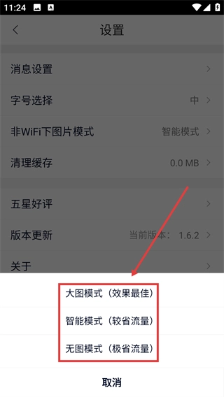 3、点击【非WiFi下图片模式】后,在弹出的选项里挑选模式(例如【大图模式】),根据自身需求切换加载效果。