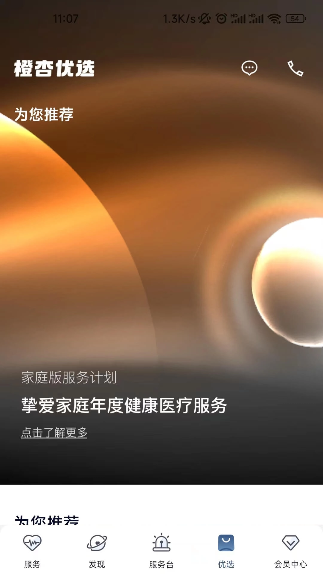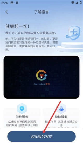 2、在“了解橙杏”页面,点击【选择服务权益】按钮,即可进入服务权益说明页面。