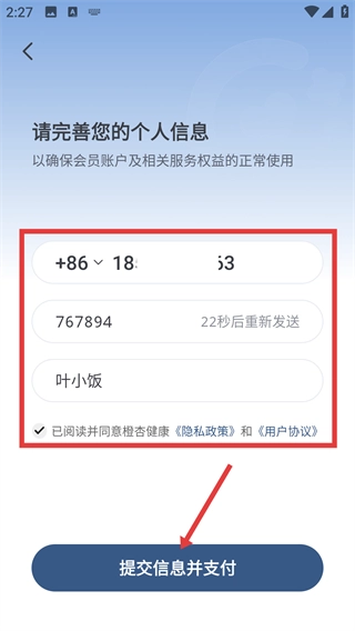 4、进入个人信息填写页面后,补充好号码、验证码、姓名等相关信息,点击【提交信息并支付】按钮,即可完成入会申请流程。
