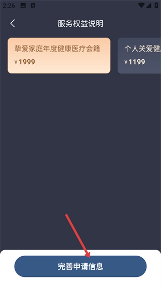 3、进入服务权益说明页面后,选定目标会籍,点击【完善申请信息】按钮,即可进入个人信息填写页面。