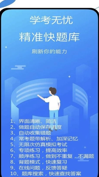 学考无忧是一款专注服务全国考证学生的软件,涵盖专项练习、顺序练习、模拟练习、错题强化、真题练习、考前押题、背题模式等功能,还配备对应科目的理论精讲视频与实操视频。软件提供适配考试新动态的题库,实时更新内容,助力用户应对考试变化,既是学员通过考试的实用工具,也是培训机构与学校合作的优质服务平台。拥有此库,学考无忧。我们的宗旨是让考证过程变得简单又有趣!