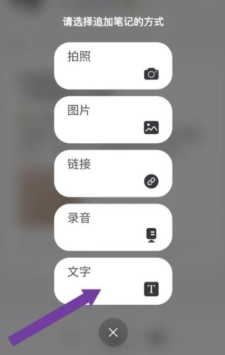 3.打开“请选择追加笔记的方式”列表,点击【文字】选项