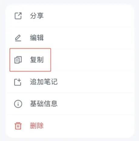 2.进入菜单页面,点击【复制】,即可复制该篇笔记